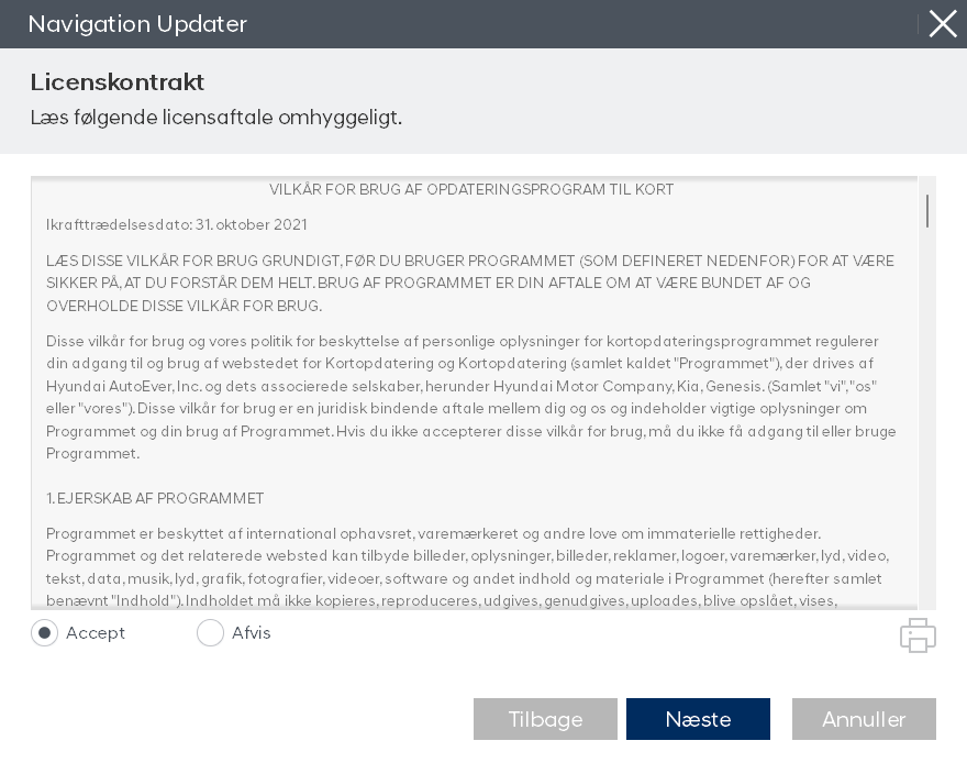 Når programinstallationen er klar, skal du gennemgå vilkårene i licensaftalen og brugerrettighederne til navigationsopdateringssoftwaren, markere bekræftelses- og aftaleknappen og derefter klikke på knappen "Næste".