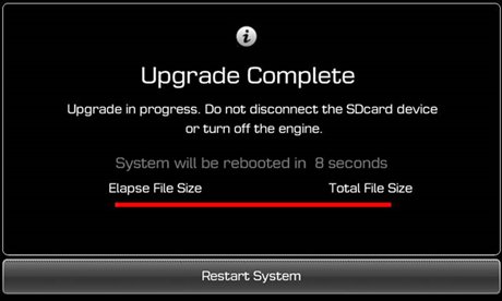 Tryk på knappen "Restart system", når opgraderingen er fuldført, eller vent 10 sekunder, hvorefter systemet genstarter om 10 sekunder