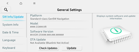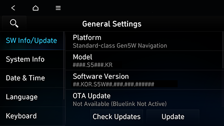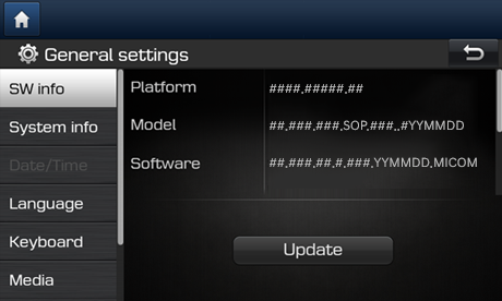 Vælg "SW Info/Update" på skærmbilledet General Settings og derefter knappen "Update" for at fortsætte opdateringen