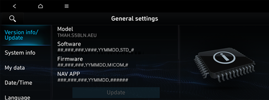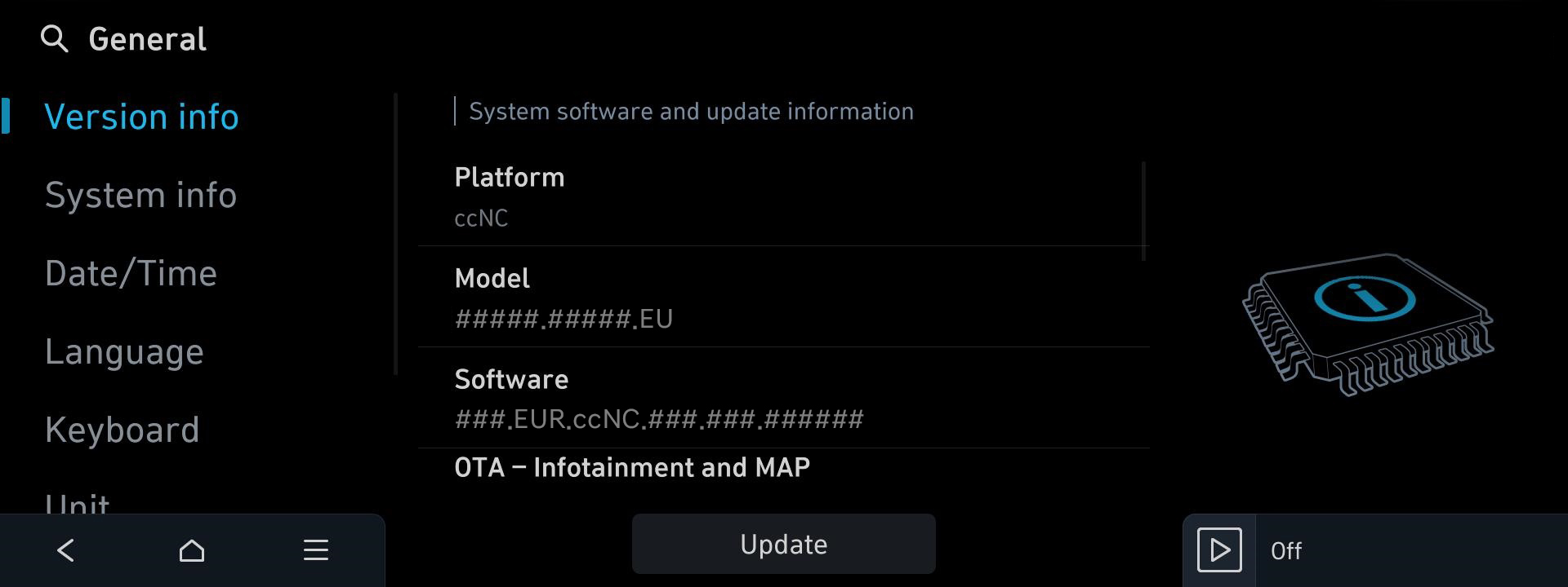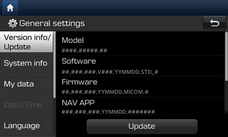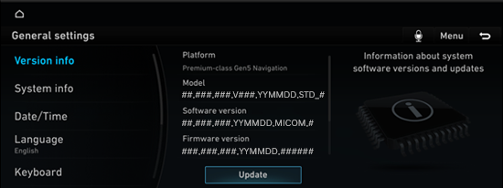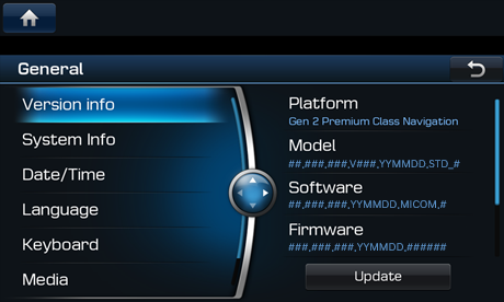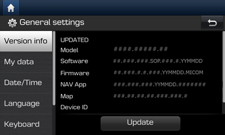 Vælg "Version info" på skærmbilledet General og derefter knappen "Update" for at fortsætte opdateringen