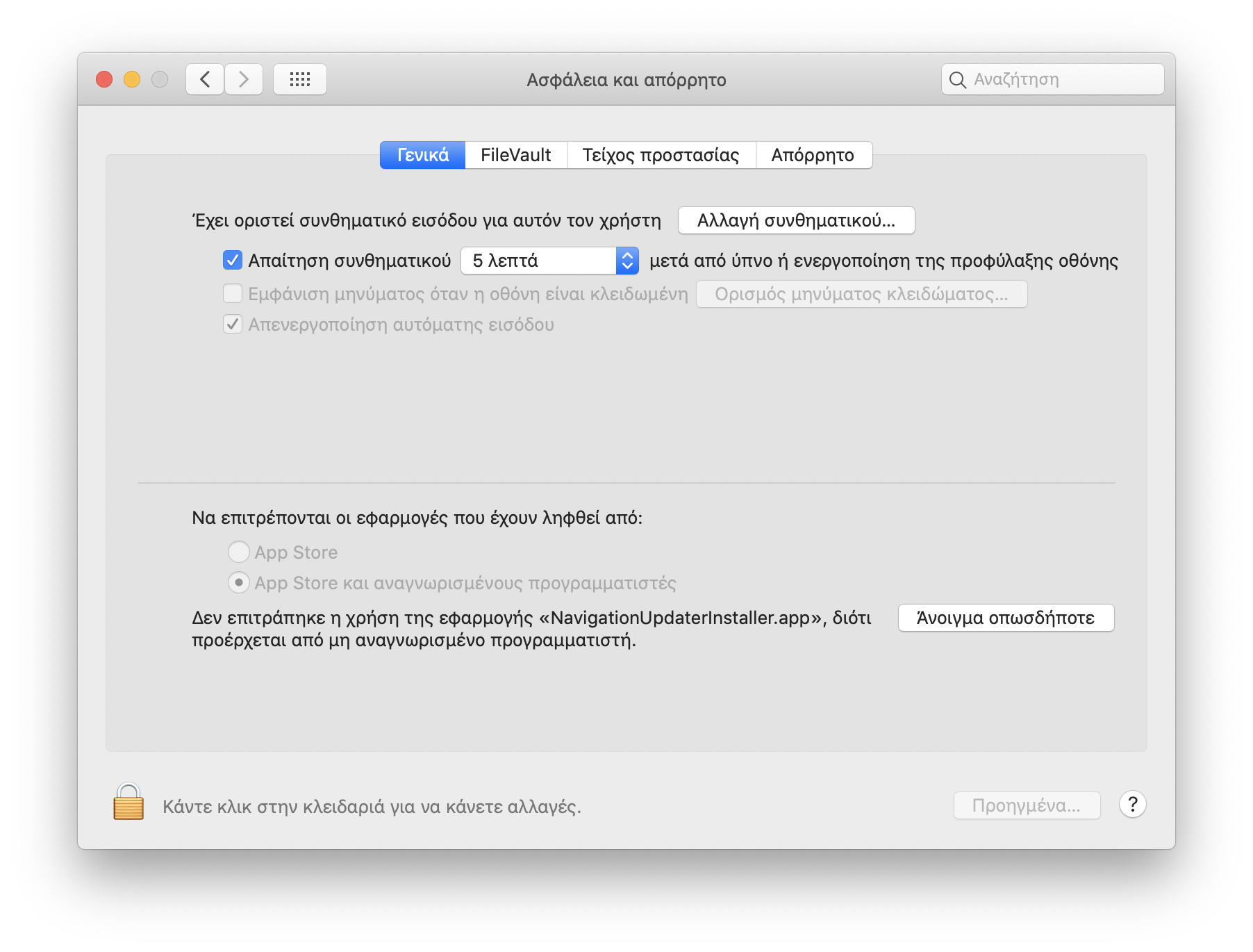 Στα [Ασφάλεια και απόρρητο] > [Γενικά] > [Να επιτρέπονται οι εφαρμογές που λαμβάνονται από], κάντε κλικ στο κουμπί «Άνοιγμα σε κάθε περίπτωση».