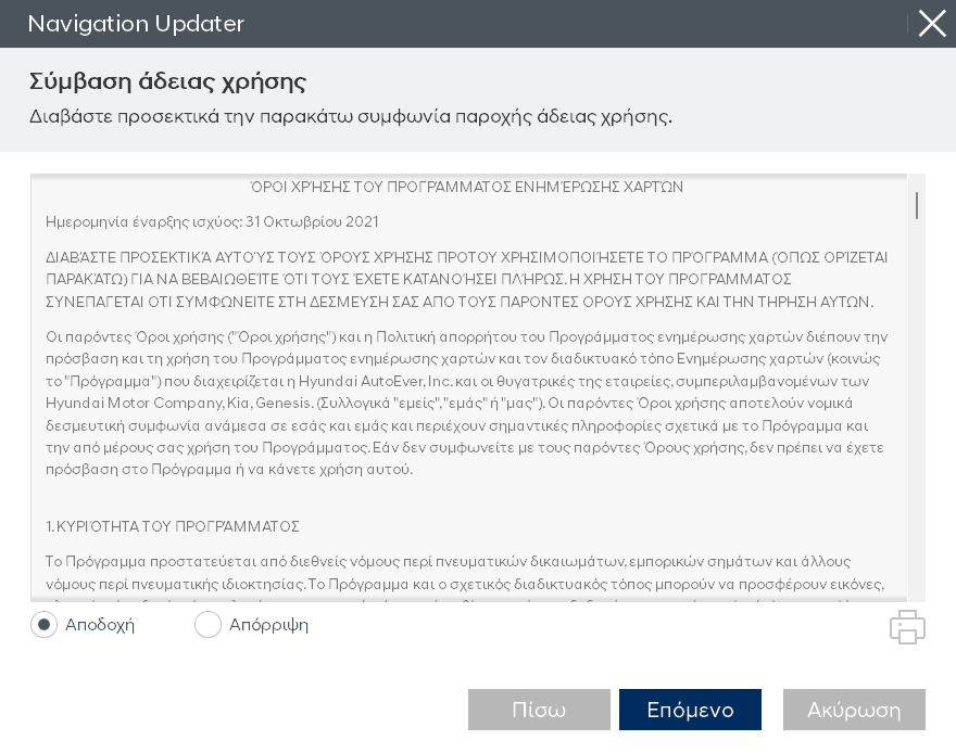 Μόλις ολοκληρωθεί η εγκατάσταση του προγράμματος, ελέγξτε τους όρους της άδειας χρήσης και τα δικαιώματα χρήσης του λογισμικού ενημέρωσης πλοήγησης, επιλέξτε το κουμπί επιβεβαίωσης και συμφωνίας και, στη συνέχεια, κάντε κλικ στο κουμπί «Επόμενο».