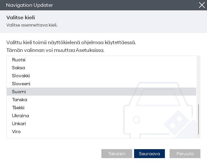 Valitse kieli, jota haluat käyttää ohjelmassa, ja napsauta sitten ”Seuraava” -painiketta.