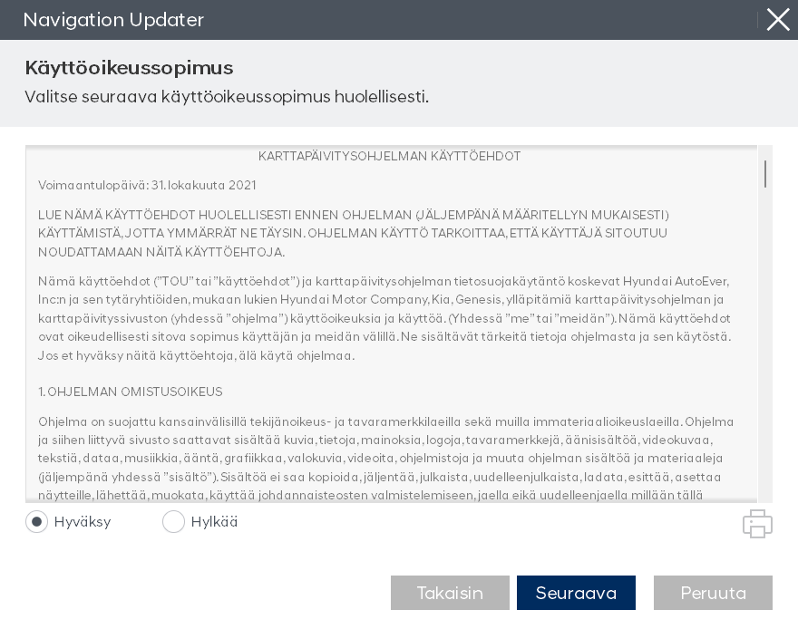 Kun ohjelman asennus on valmis, tarkista lisenssisopimuksen ehdot ja navigointipäivityksen ohjelmiston käyttöoikeudet, valitse vahvistus- ja sopimuspainike, ja napsauta sitten ”Seuraava” -painiketta.