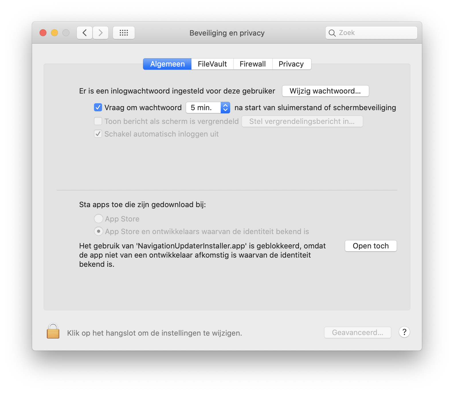 Klik in [Beveiliging en privacy] > [Algemeen] > [Apps toestaan waarin downloads zijn uitgevoerd] op de knop 'Toch openen'.