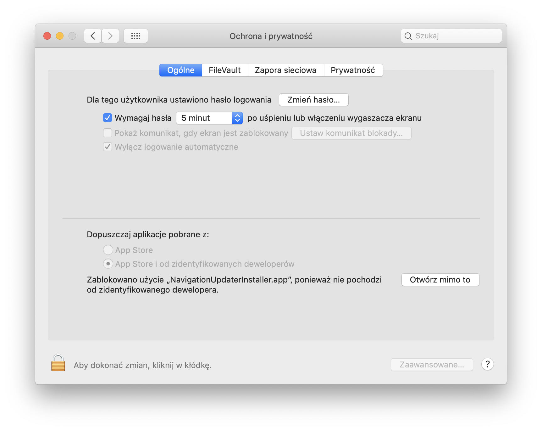 W pozycji [Bezpieczeństwo i prywatność] > [Ogólne] > [Zezwalaj na aplikacje pobrane z], kliknij przycisk „Otwórz mimo to”.