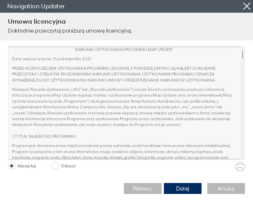 Po zakończeniu instalacji programu zapoznaj się z warunkami umowy licencyjnej i prawami użytkowania oprogramowania do aktualizacji nawigacji, zaznacz przycisk potwierdzenia i zgody, a następnie kliknij przycisk „Dalej”.