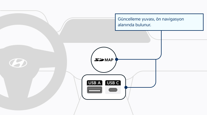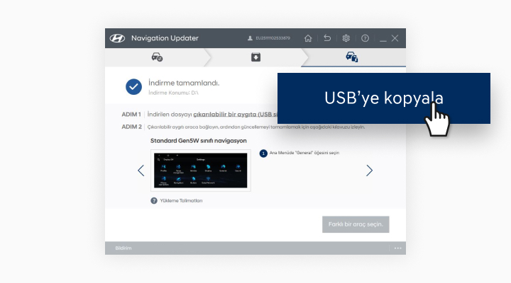 "Lütfen taşınabilir aygıtı (USB) aracınıza götürün ve güncelleme işlemine devam edin.Talimatlar aşağıda verilmiştir."