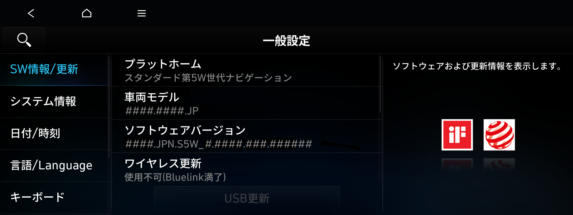 [ソフトウェア情報/更新]を選択し、[更新]を押してください。更新が開始します。