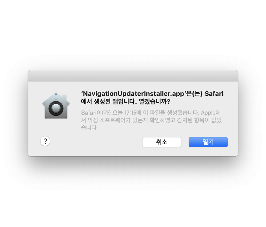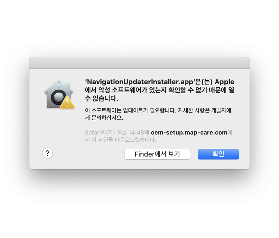 Navigation Updater 설치 시, 확인되지 않은 개발자 앱 열기 팝업이 표시될 수 있습니다.