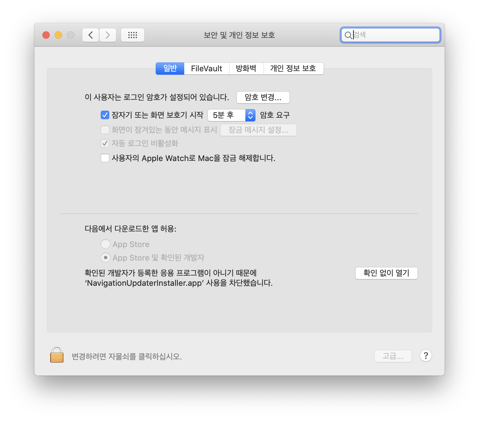 [보안 및 개인 정보 보호] > [일반] > [다음에서 다운로드한 앱 허용]에서 "확인 없이 열기" 버튼을 클릭해주십시오.