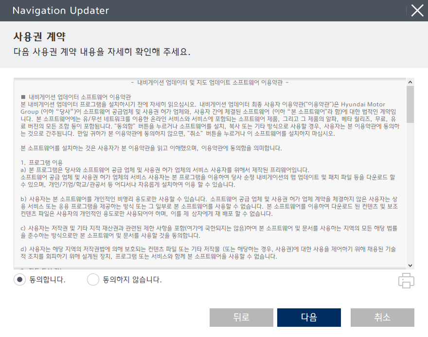 프로그램 설치가 준비되면, 사용권 계약의 조항과 내비게이션 업데이트 소프트웨어 사용권에 대한 내용의 확인 및 동의 버튼을 체크하신 후 "다음" 버튼을 클릭해주십시오.