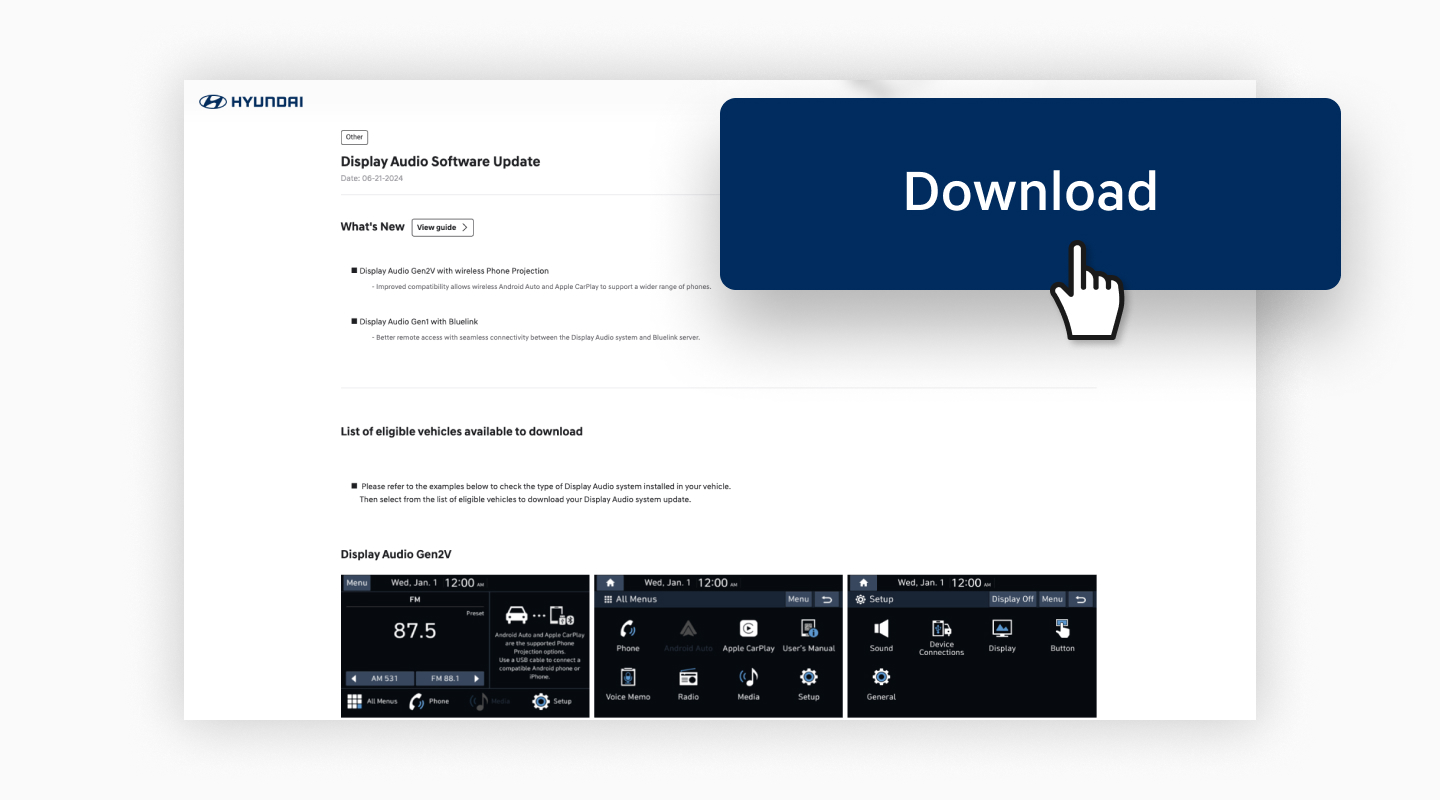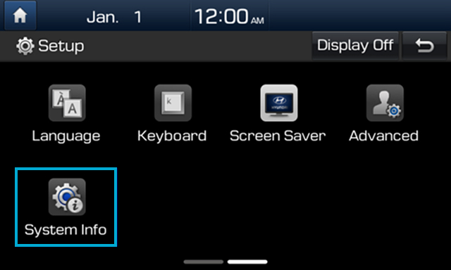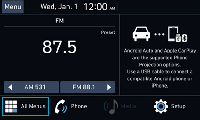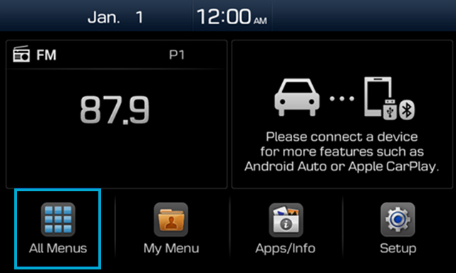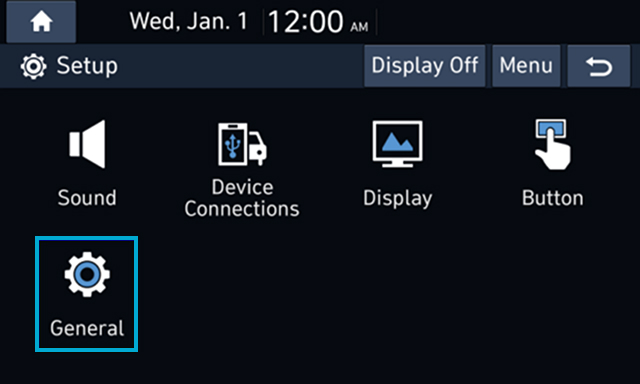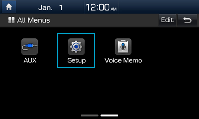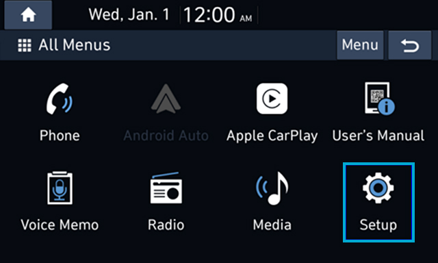 Press the "Setup" key or tap the Setup touchscreen button in the All Menus section of the Display Audio system.