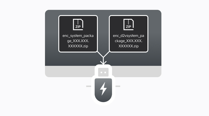 - After connecting an empty USB drive, copy the two zip files to the USB drive (minimum 4GB).DO NOT unzip/extract this file before copying to the USB drive.File name: enc_system_package_XXX.XXX. XXXXXX.zipenc_d2vsystem_package_XXX.XXX. XXXXXX.zipDO NOT unzip/extract this file before copying to the USB drive.