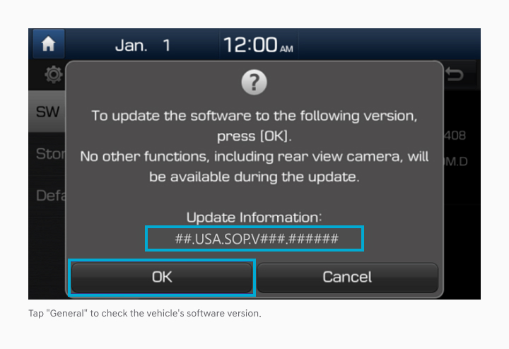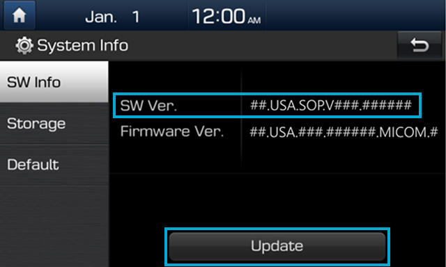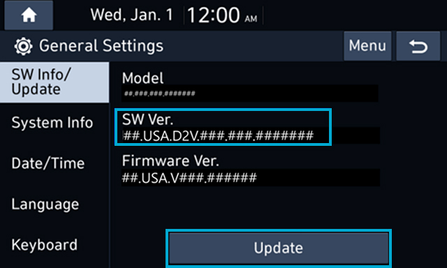 - Select [All menus] > [Setup] > [General] > [SW Info/Update], then select [Update].*Depending on the vehicle and specification, your screen may look different from the one shown below.