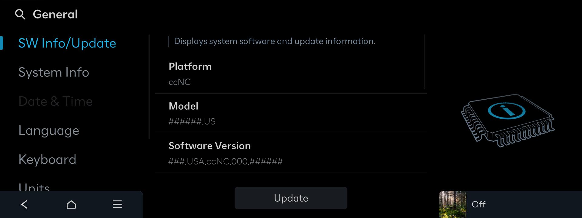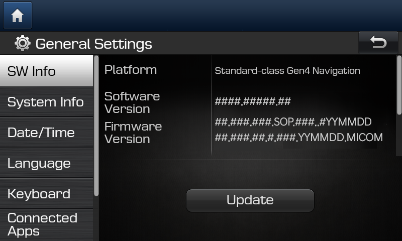 Select “SW Info/Update” on the General Settings screen and then the “Update” button to proceed with the update
