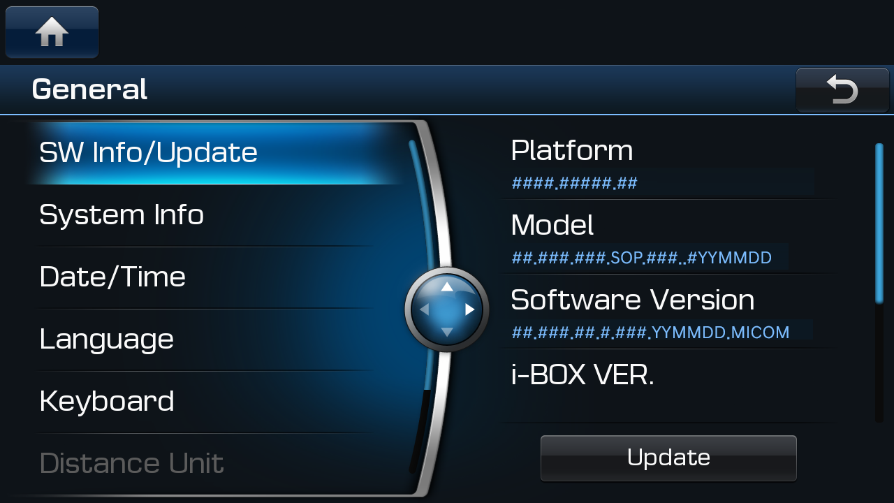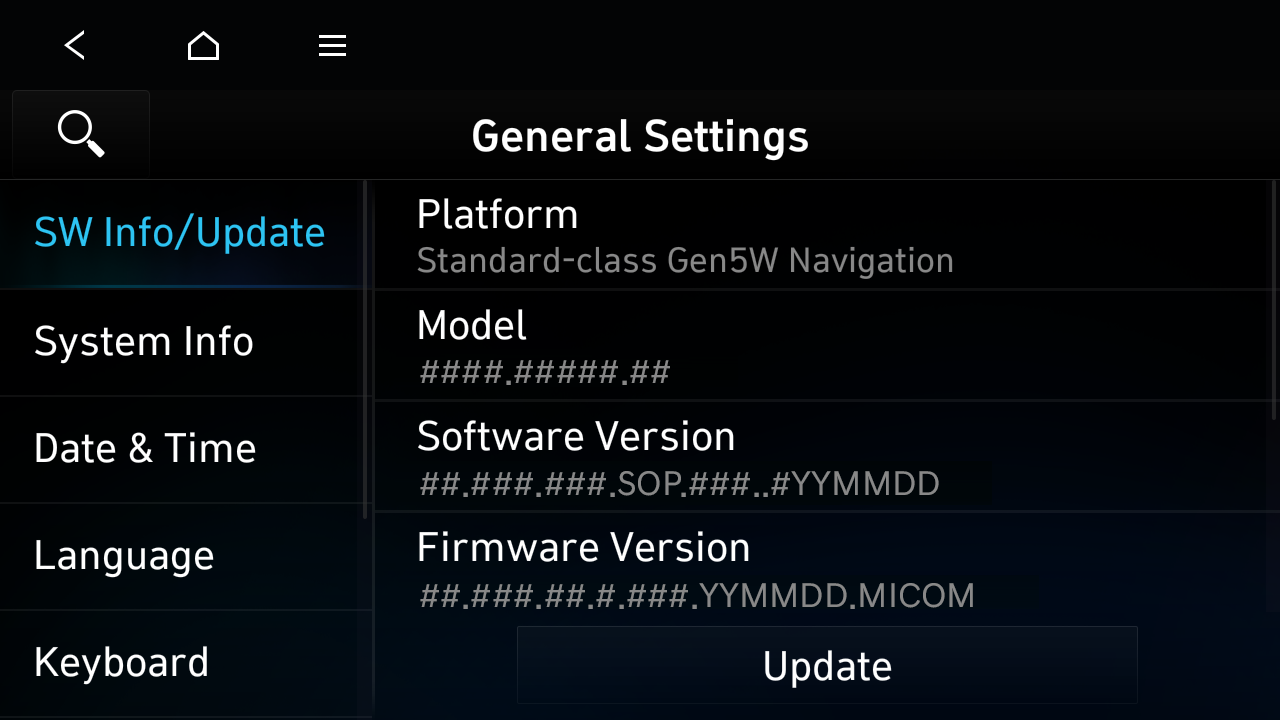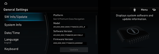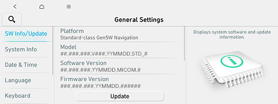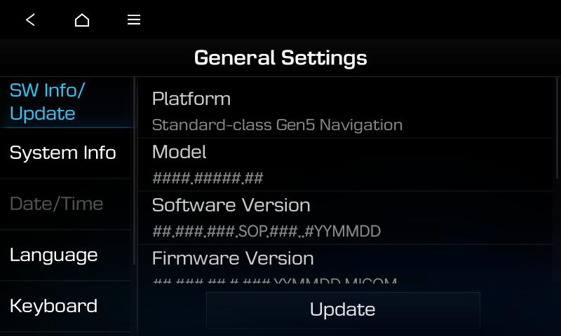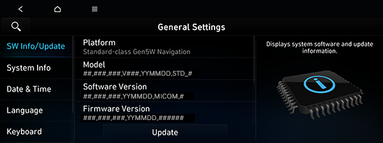 - From the navigation’s main menu, go to [Settings] > [General] > [SW Info/Update] tab, then select [Update].
